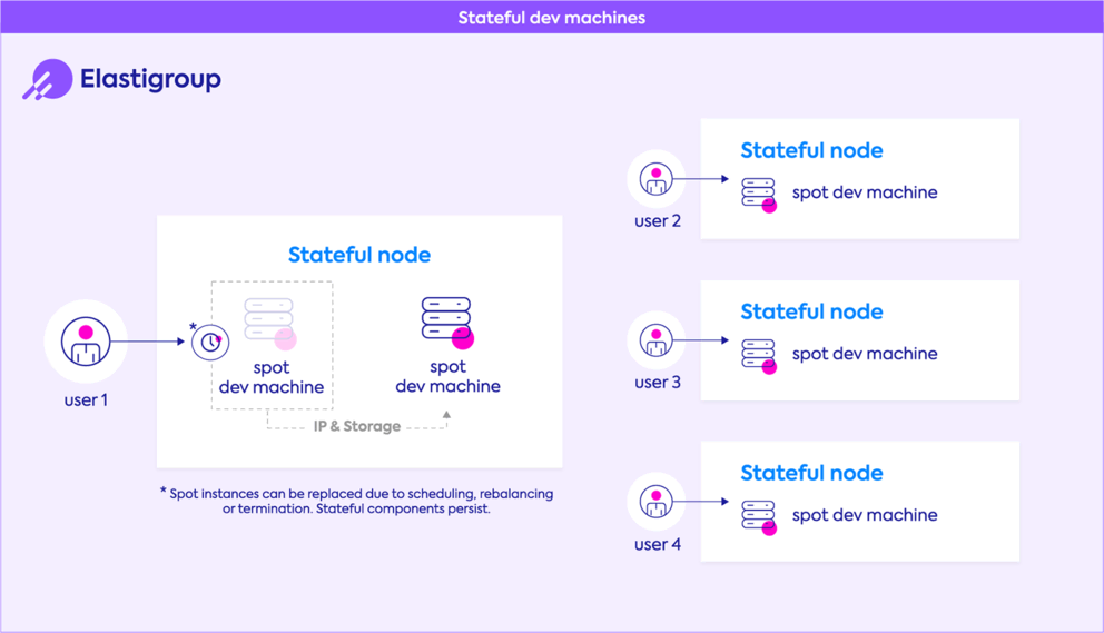 Elastigroup Stateful Node enables you to run stateful applications on stateful nodes. Stateful Node utilizes spot nodes while providing persistence for the root volume, data volumes and network interface, in addition to other launch specifications during node replacements.